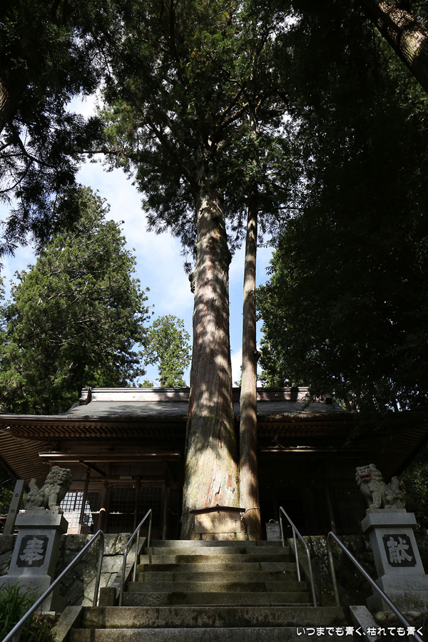 稲橋八幡神社は、広い神社ではありますが、誰もいなくてひっそりとしていました。本殿の前にあるご神木は、スギとヒノキの合体木です。右のヒノキを左のスギが抱きかかえています。スギの樹齢は700年とのこと。合体木は、夫婦和睦、家庭繁栄を表すとのことです。