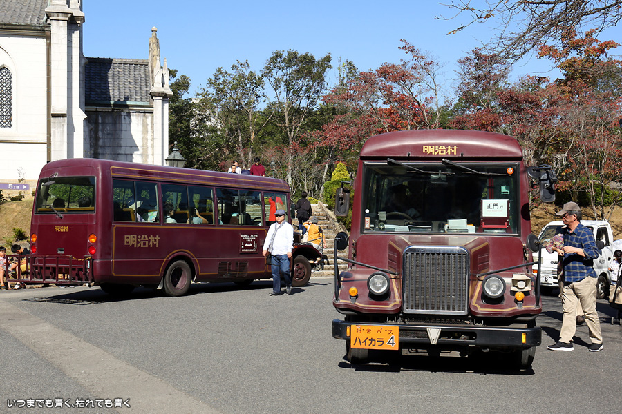 明治村のなかを走ったり展示されている乗り物たちの写真です。美しい風景と古い建物の中に、レトロな姿の乗り物たちがよく似合います。