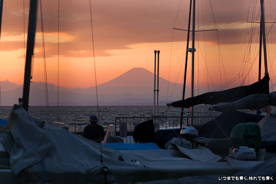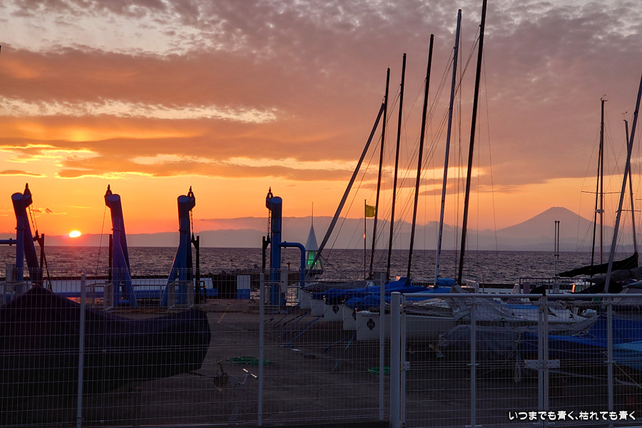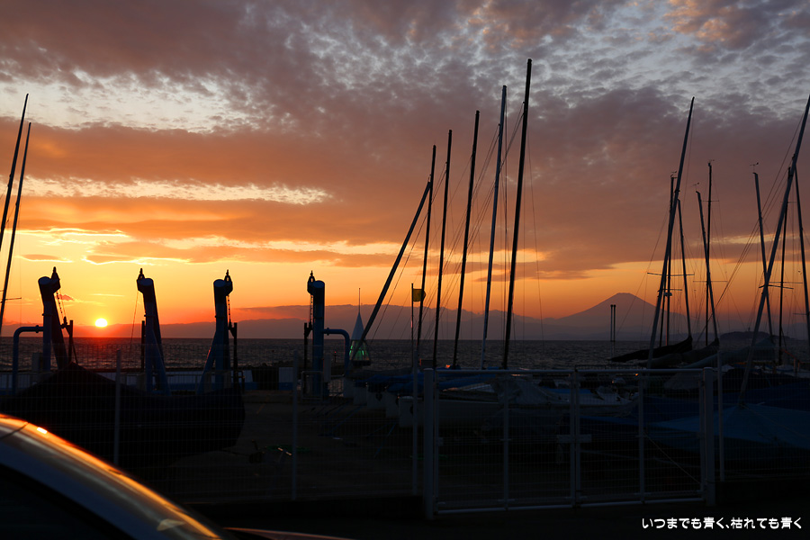三浦市三崎から横浜へ戻る途中に、美しい夕陽と富士山が見えたので、葉山マリーナ横のコンビニの駐車場に車を止めて撮影した写真です。葉山マリーナとコンビニ駐車場の間にはワイヤーフェンスがあってその隙間からの撮影ですが、数枚撮っているうちに夕日は沈んでしまいました。運転中に見つけた光景なので、これだけでも撮影出来て幸運でした。