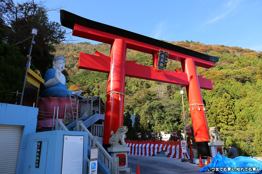横浜から自宅へ向かう途中に、箱根神社、芦ノ湖に寄り道しようと旧東海道(県道732号線)を走っていた時に見つけた神社です。大きな赤い鳥居が私を呼び寄せているようでした。中に入ると色彩鮮やかな建物や仏像がたくさんあって普通の神社とはちょっと雰囲気が異なっています。箱根大天狗山神社のホームページの「由来について」を読むと、神仏を共に祀り神事だけではなく供養もおこなっている神社と書かれています。開山は昭和55年と比較的新しい神社です。平成6年には、釈迦如来も祀られました。そういう神社であるせいか、参道の鳥居以降は写真撮影は禁止となっていました。