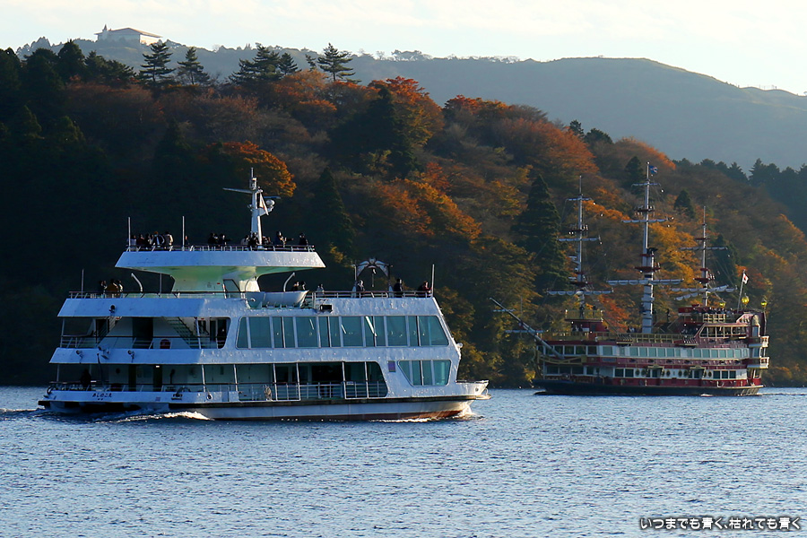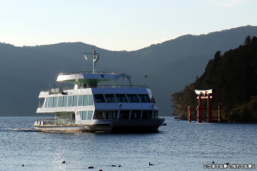 箱根神社に参拝したあと、芦ノ湖のほとりを巡り、のんびりと湖面と遊覧船と夕日を眺めていました。