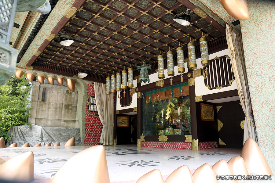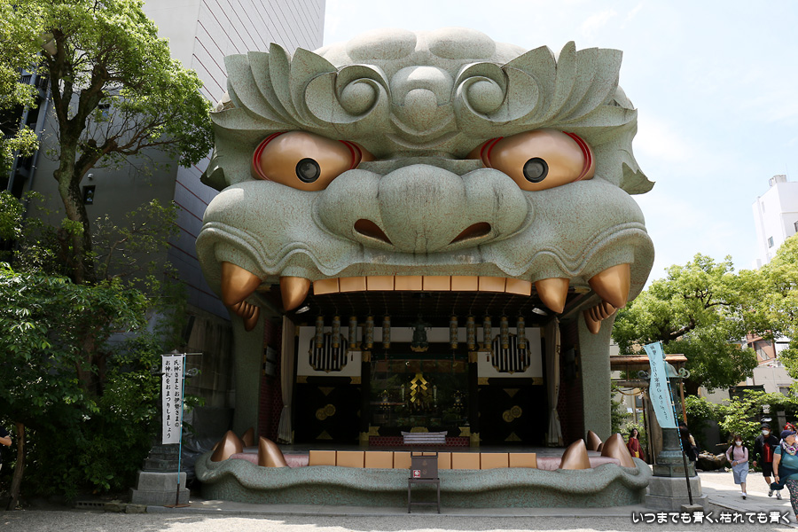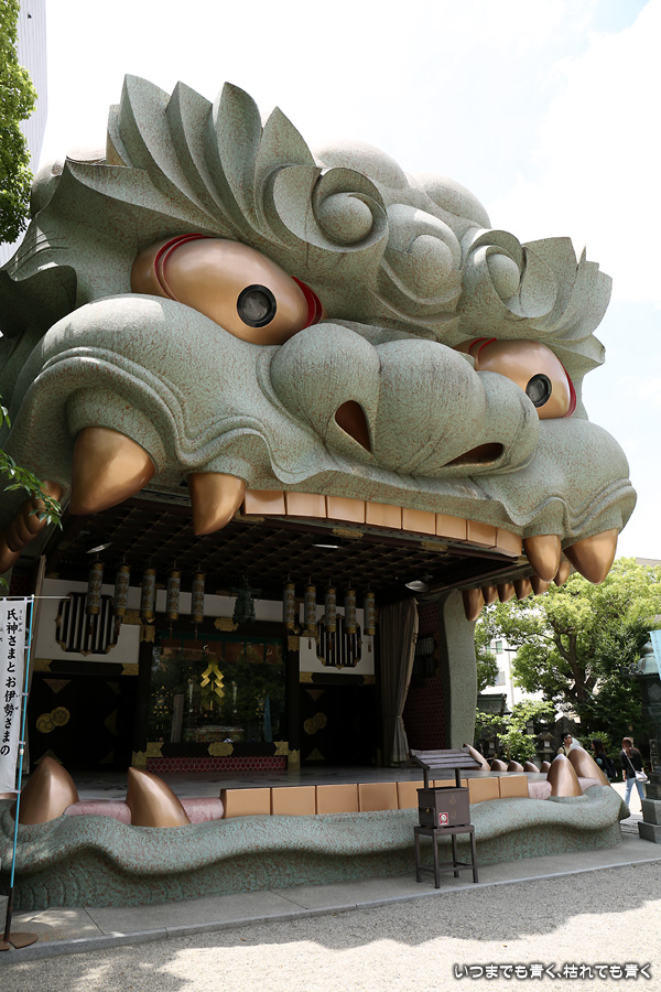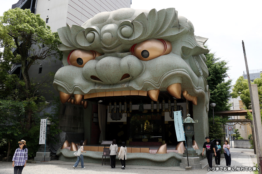 事前に調べて、難波八阪神社の獅子殿(獅子舞台)がパワースポットということなので、一度見ておこうと思って参拝しました。境内に車が止まっていましたが基本的には駐車場は近隣のコインパークを利用することになります。目的の獅子殿は思っていたよりも大きくて立派でした。獅子殿は、大きな口で勝利を呼び、邪気を飲み勝運(商運)を招くと言われており、学業向上、就職、入試、会社発展等の祈願する参拝者が絶えないそうですが、この日の参拝者は外国の方が多くて、本来の参拝目的で来ている人は少なそうでした。